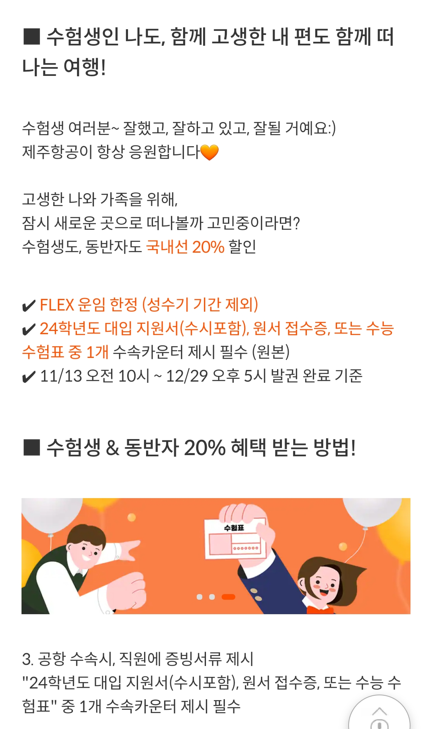 3) 이스타항공 : 12월 15일까지 특별 신분 할인 대상으로 수험생과 동반 1인을 지정해 제주노선 할인 혜택을 제공합니다.