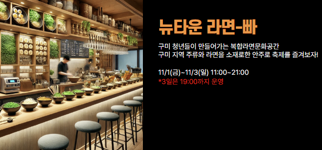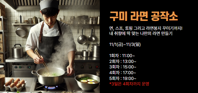 경북 구미에서 라면축제가 11월 1일(금)부터 3일(일)까지 개최됩니다. 다양한 이색라면 요리를 맛볼 수 있으며, 그외 라면테마 전시, 체험, 포토존, 무대프로그램, 각종 이벤트 등으로 풍성하게 준비되어있습니다. 더불어 개막축하공연과 연예인들의 공연 등으로 더욱 축제의 열기가 뜨거울 예정이니, 일정 및 프로그램 확인 후 축제를 즐기시길 바랍니다.
