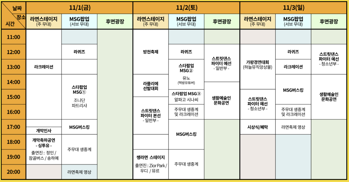 라면레스토랑 오프닝행사, 개막축하행사 폐회행사 MSG팝업 : 라퀴즈, MSG팝업 : 스타팝업 MSG팝업 : 버스킹 쌩(Live)라면스테이지(축하공연) [연계]가왕경연대회 등