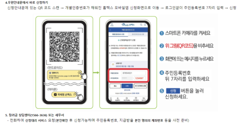 스마트폰 카메라로 근로장려금 신청안내문에 표시된 QR코드를 스캔하고, 화면에 뜨는 링크를 클릭하면 신청페이지로 이동하고, 주민번호 뒷자리를 입력하시면 됩니다.