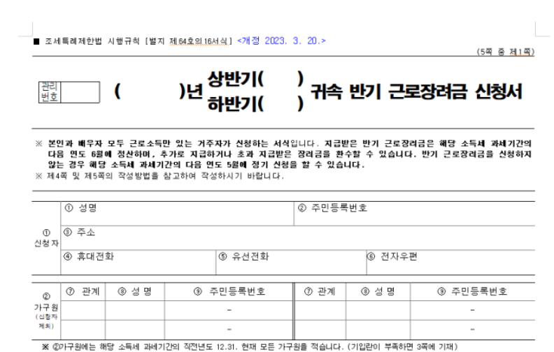 2024년 3월 신청의 경우 2023년 하반기 귀속 반기 근로장려금 신청서라고 기재해야 하며, 아래 기입에 대한 샘플 양식은 세무서에 비치되어 있으니 방문 시 도움을 받아서 꼼꼼하게 작성, 제출하시면 됩니다.