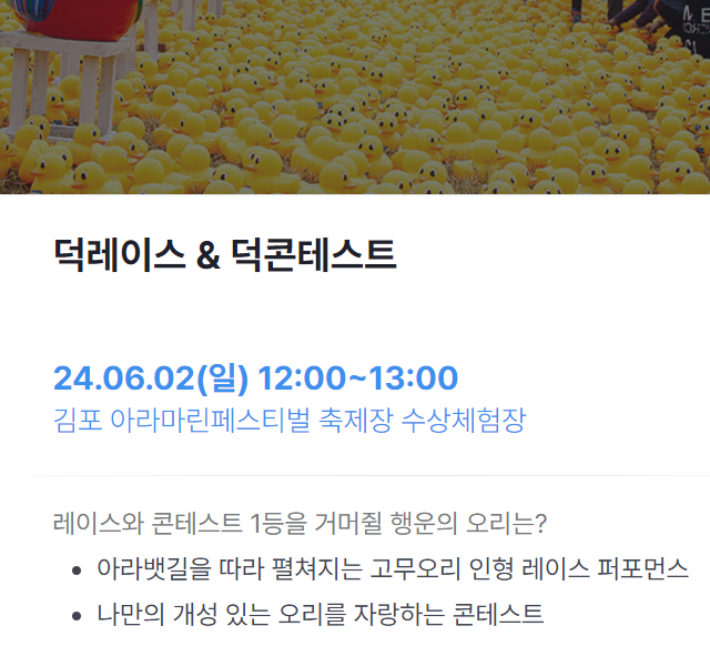 '2024 김포 아라마린페스티벌'이 더욱 풍성한 볼거리, 즐길거리로 6월 1~2일 개최됩니다. 오직 김포 아라마린페스티벌에서만 즐길 수 있는 귀여운 장난감 오리들의 레이싱(덕레이스 프로그램)뿐만 아니라, 물‧환경을 테마로 수상레저체험, 마린랜드(물놀이존), 문화콘서트, 에코체험부스 및 각종 이벤트를 제공하여 남녀노소 즐길 수 있는 축제의 장을 마련합니다.