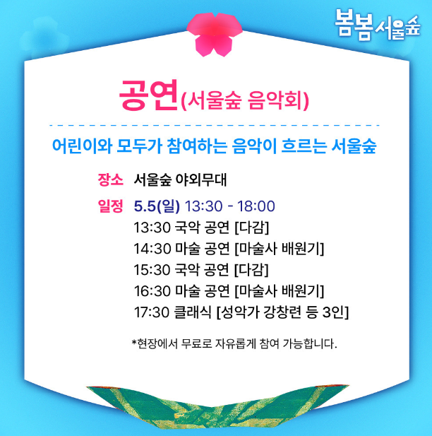 서울시가 가정의 달을 맞아 어린이들과 가족을 위해 서울숲을 방문하는 모두가 즐길 수 있는 ‘2024 봄봄 서울숲 축제’를 5월 4일부터 18일까지 개최합니다. 5월 5일 어린이날은 서울숲 야외무대에서 어린이들 및 누구나 흥겹게 즐길 수 있는 다양한 마술쇼와 퓨전 국악공연, 성악과 바이올린이 들려주는 쉽고 재밌는 클래식 공연도 만나볼 수 있습니다. 무료로 진행되는 행사 공연과 함께 준비된 다양한 예술 생태 체험활동은 사전예약으로 참여가 가능합니다. 5월 가정의 달을 맞아 어린이와 함께하는 풍성한 축제를 맞으시길 바랍니다.
