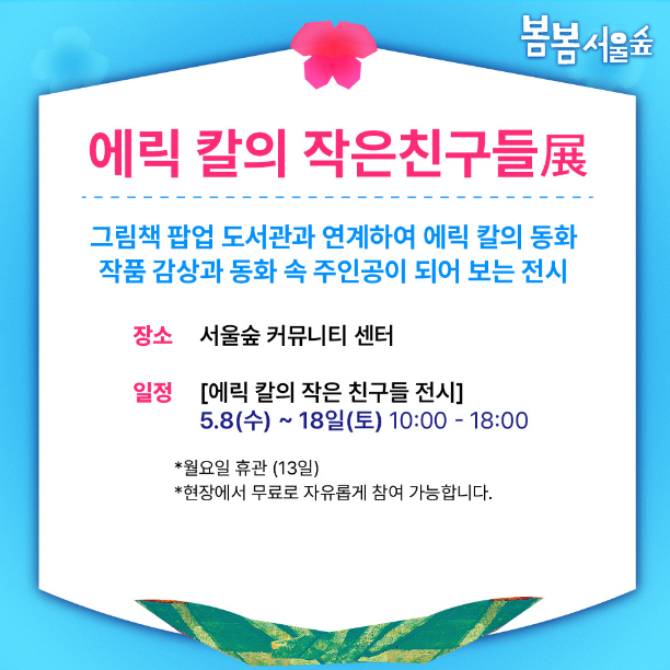 서울숲과 에릭 칼 그림책의 생태와 자연물을 주제로 가족이 함께 그림책 만들기(※사전 예약, 어린이 동반 가족, 15 가족, 5천 원)