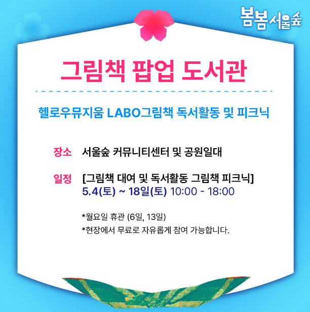 5월 가정의 달 맞아 동화작품 전시·감상, 야외공연 등 공원 속에서 즐기는 동심 문화여행을 2024 봄봄서울숲 축제에서 어린이들과 함께 그리고 연인, 가족 누구나 열린 푸른 숲에서 싱그러운 추억을 만드시길 바랍니다.