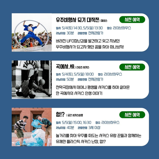 - 사전예약 프로그램 : 우주비행사 되기 대작전, 곡예사, 합!?, 함께 배우는 아크로바틱, 함께 배우는 서커스 체조
