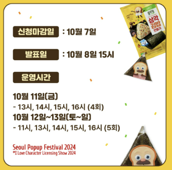 서울 팝업 페스티벌 2024 & 아이 러브 캐릭터 라이선싱 쇼 2024가 서울 양재역 인근의 aT 센터 전시장에서 10월 11일(금)부터 10월 13일(일)까지 사흘간 진행됩니다. 캐릭터에 관심이 많으신 분들께는 더할 나위 없는 팝업의 신세계를 경험하실 수 있으며, 무료관람을 위해 사전 등록을 하시기 바랍니다.