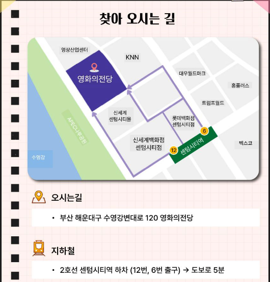 - 대중교통: 지하철 2호선 센텀시티역 하차 (12번, 6번 출구 도보 5분)