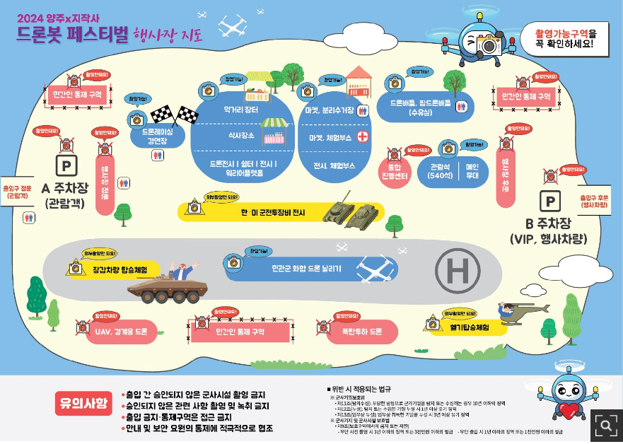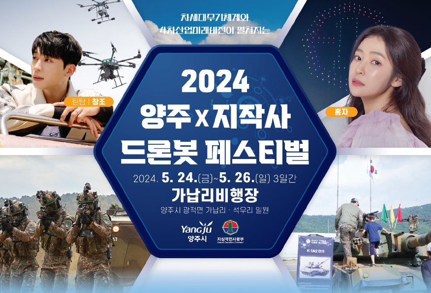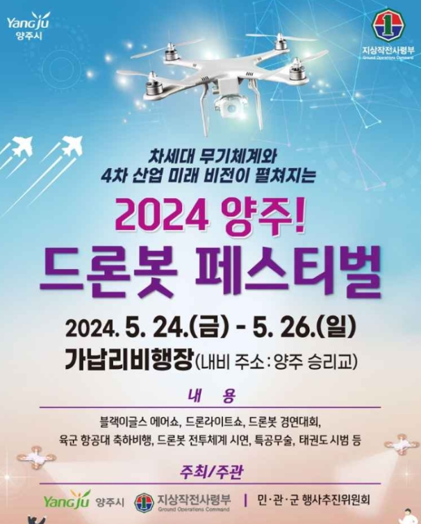 양주시가 지상작전사령부와 함께 5월 24일부터 26일까지 가납리비행장에서 3일간 ‘2024 양주! 드론봇 페스티벌’을 개최합니다. 드론, 비행기, 로봇, 탱크 등에 관심 많은 분들께 최고의 축제의 장이 될 것으로 생각됩니다. 군장비를 눈앞에서 체험하고 블랙이글스 에어쇼, 헬기축하비행 그리고 드론300대의 드론쇼까지 화려한 볼거리를 선사할 예정입니다.