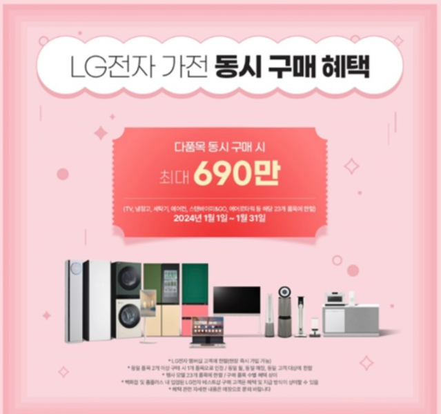 1)냉장고, 세탁기, 건조기, 스타일러, 공기청정기 등 23개 제품군 중 2개 품목 이상 구매한 고객을 대상으로 하며, 구매한 제품 수에 따라 최대 690만 원 상당의 캐시백 또는 상품권 혜택을 제공