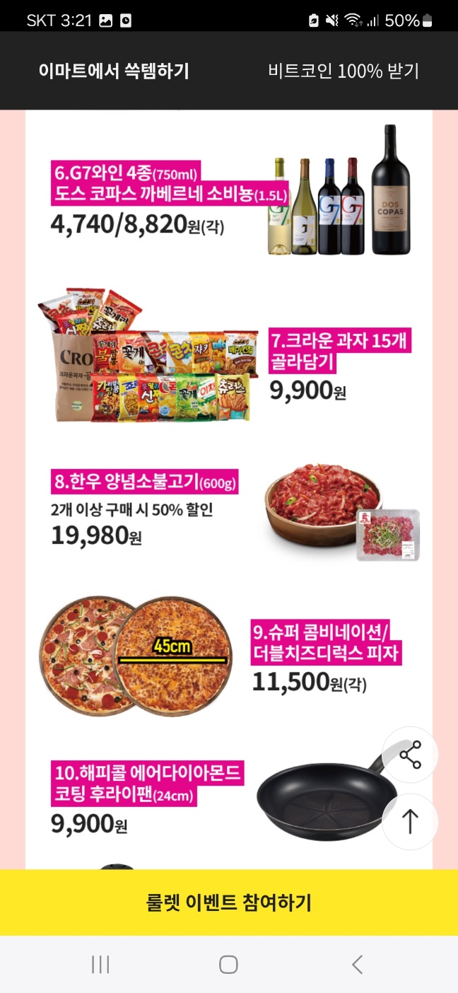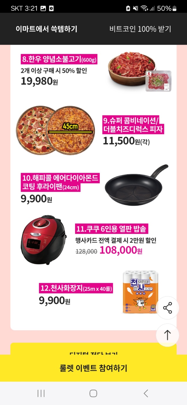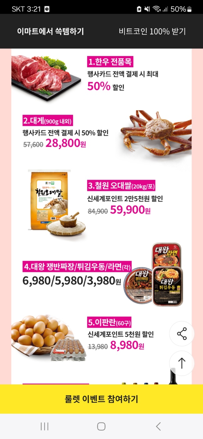 3) 냉동피자/ 파스타소스/ 냉장떡볶이 / 냉장 맛살 / 냉장 유부 / 국산두부 / 케첩/마요네즈 / 참치 / 골뱅이캔 / 들기름 / 참기 름 / 올리브유 / 카레/짜장 / 상온 즉석국탕까지 2개 이상 구매 시 50% 할인