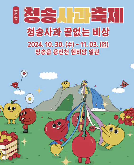 청송사과축제가 2024년 10월 30일(수)부터 11월 3일(일)까지 5일 동안 경북 청송군 용전천 현비암 일원에서 펼쳐집니다.전국 최고품질의 사과 고장에서 개최되는 이번 축제에는 매일 초대가수 축하공연이 펼쳐집니다. 전국축제 중 이렇게 많은 인기가수의 공연이 펼쳐지는 축제는 없는 듯하니, 일자별 라인업 확인 후 축제를 즐기시길 바랍니다.
