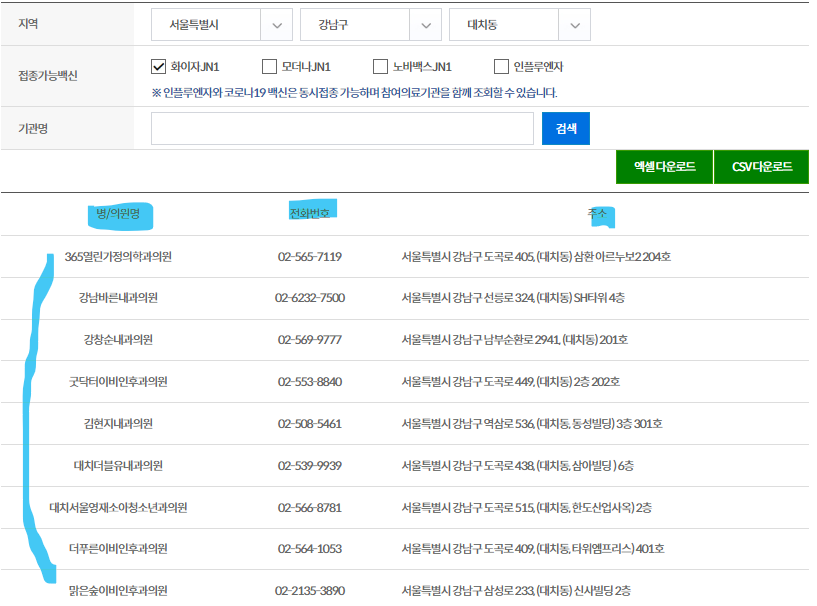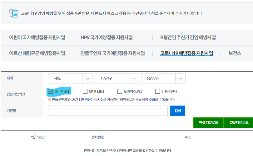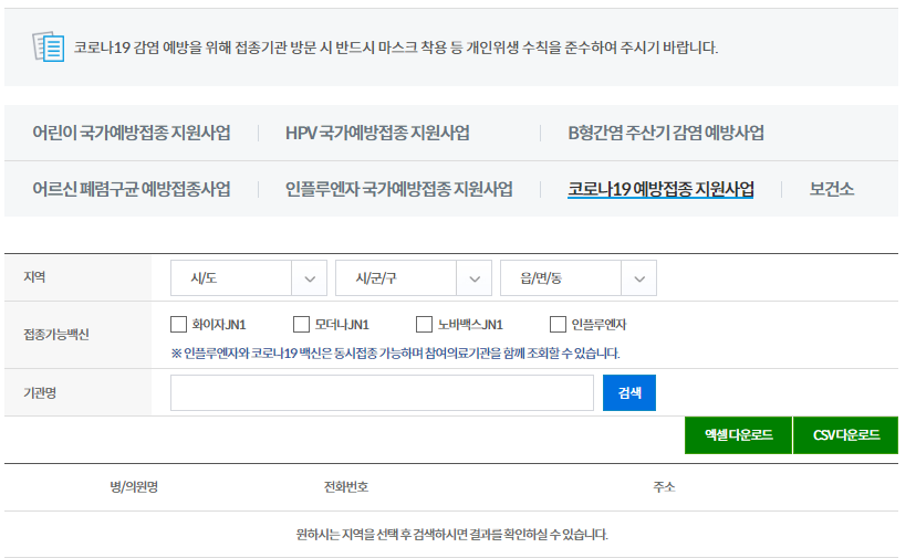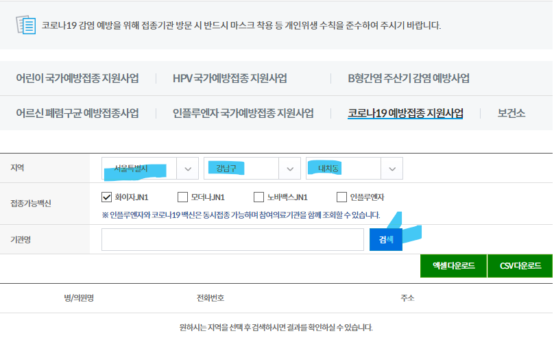 6. 최종 선택 후[검색] 버튼을 누르면 해당지역의 선택한 백신 접종이 가능한 병원 리스트가 확인됩니다.