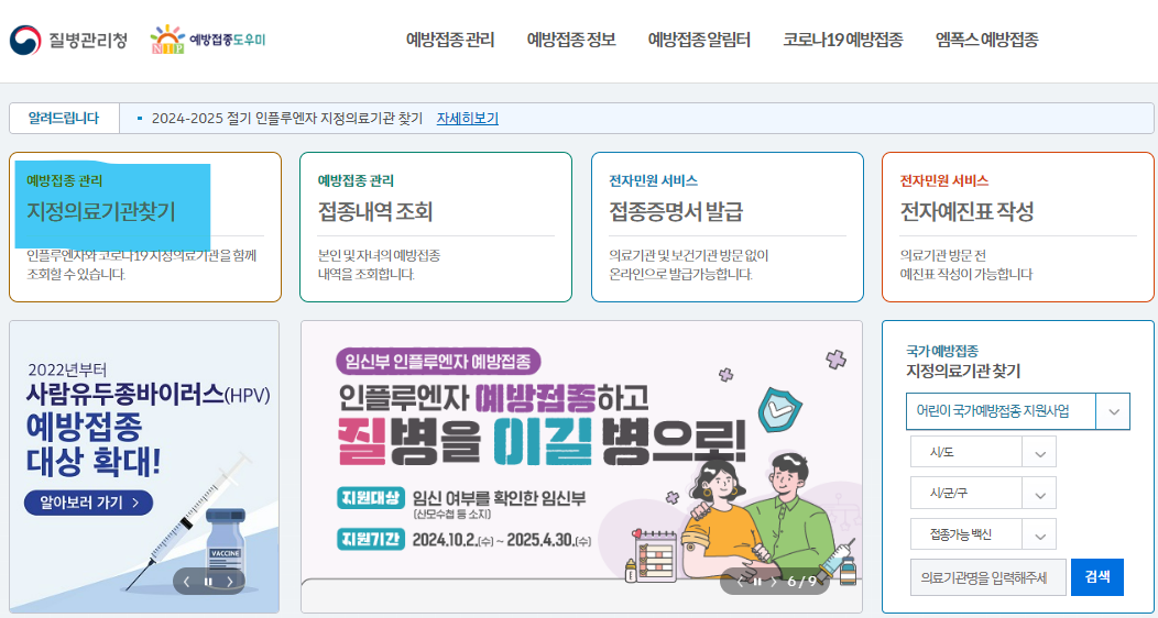 2. [예방접종관리, 지정의료기관찾기] 를 클릭합니다.