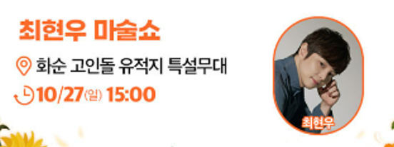 4. 무료입장 : 화순군민, 미취학아동, 장애인, 국가유공자, HOT화순 인증샷 이벤트 참가자 (신분증빙필수)