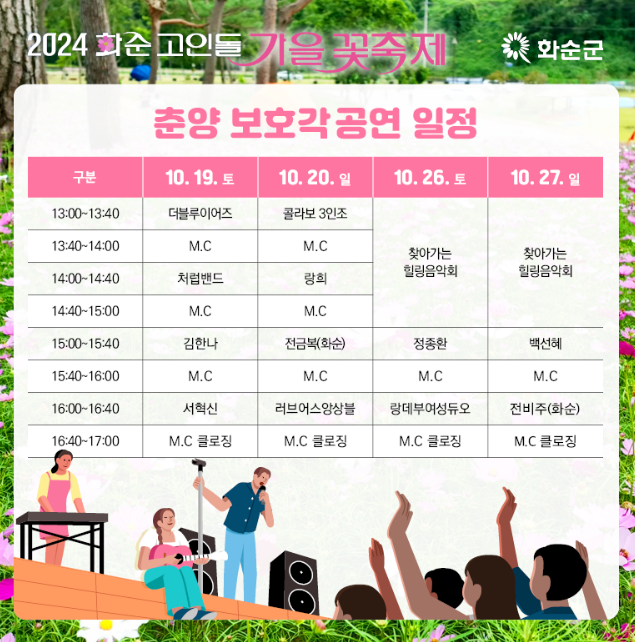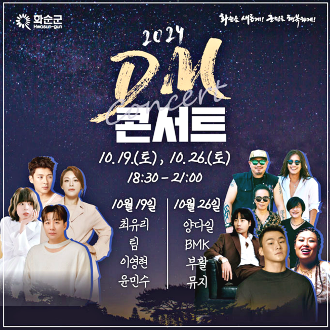 DM콘서트, 탭댄스, 퓨전음악, 아카펠라, 재즈밴드, 통기타, 트로트, 화순 지역가수 공연 등