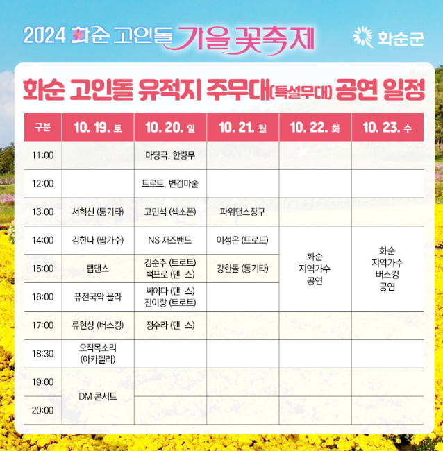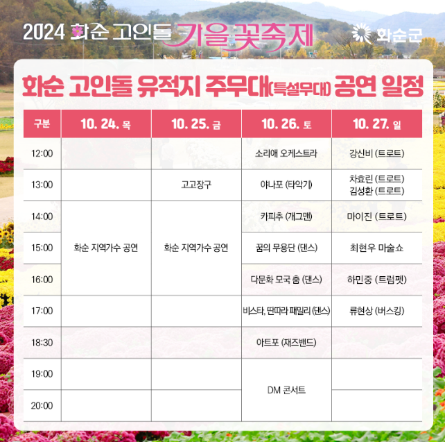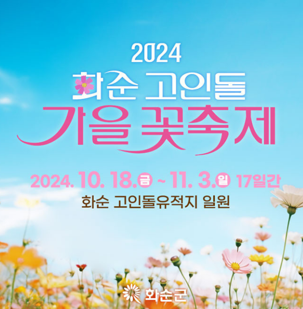 2024 화순 고인돌 가을꽃 축제가 10월 18일(금) 부터 11월 2일(일)까지 세계문화유산에 등재된 고인돌 유적지 일원에서 개최됩니다. 코스모스, 국화, 해바라기 등 가을꽃의 정취와 다양한 힐링 프로그램과 체험, 전시행사가 펼쳐지며, DM 콘서트에서는 인기가수 축하공연도 준비가 되어 있습니다.