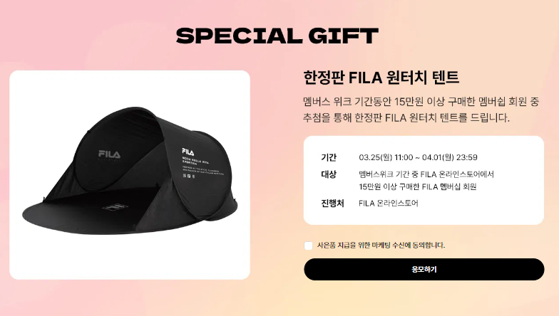 - 이벤트 응모 : 행사기간 동안 15만원 이상 구매시 추첨을 통해 FILA 원터치 텐트 지급.