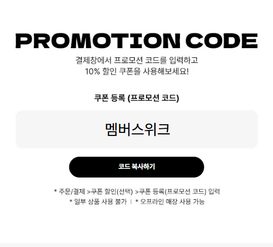 - 추가할인 : 프로모션 코드"멤버스위크"를 쿠폰 등록하여, 할인가에 추가로 10% 할인.