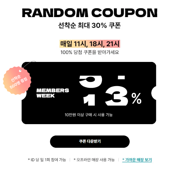 - 랜덤 쿠폰지급 : 선착순 최대 30% 쿠폰을 매일 11시, 18시, 21시 선착순 500명에게 랜덤으로 지급.