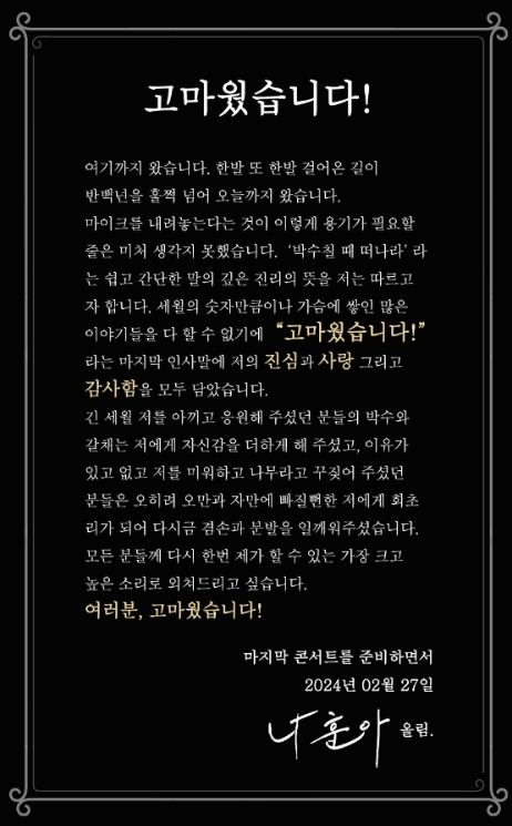 2024년 2월 27일 가황 나훈아가 갑작스레 소속사를 통해 자필 편지와 함께 은퇴를 시사면서 4월~7월 마지막 전국콘서트를 예고하였습니다. 상반기 4월부터 7월까지 인천, 청주, 울산, 창원, 천안, 원주, 전주 콘서트의 일정이 발표된 후 각 도시 콘서트의 예매 오픈일정이 공지가 되었습니다. 몇일 남지 않은 예매일에 첫 공연지 인천부터 시작되는 전국 각 지역 팬분들께서는 예매 준비에 심혈을 기울여 마지막 콘서트 객석의 주인공이 되시기 바랍니다.