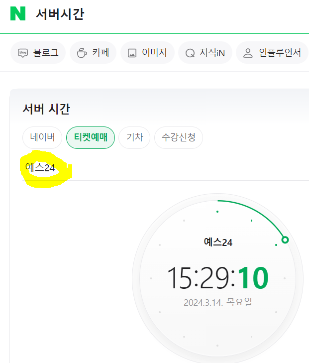 2) 티켓 오픈 시간은 휴대전화나 컴퓨터에 뜨는 시계가 아닌 '서버 시간 시계'로 정합니다. 사이트마다 서버 시간 기준 이 조금씩 차이가 날 수 있기 때문이며, 포털사이트에 '서버 시간'이라고 검색한 뒤, '[티켓 예매]-[예스 24]'로 지정하면 예스24 홈페이지 서버 시간을 확인할 수 있습니다.