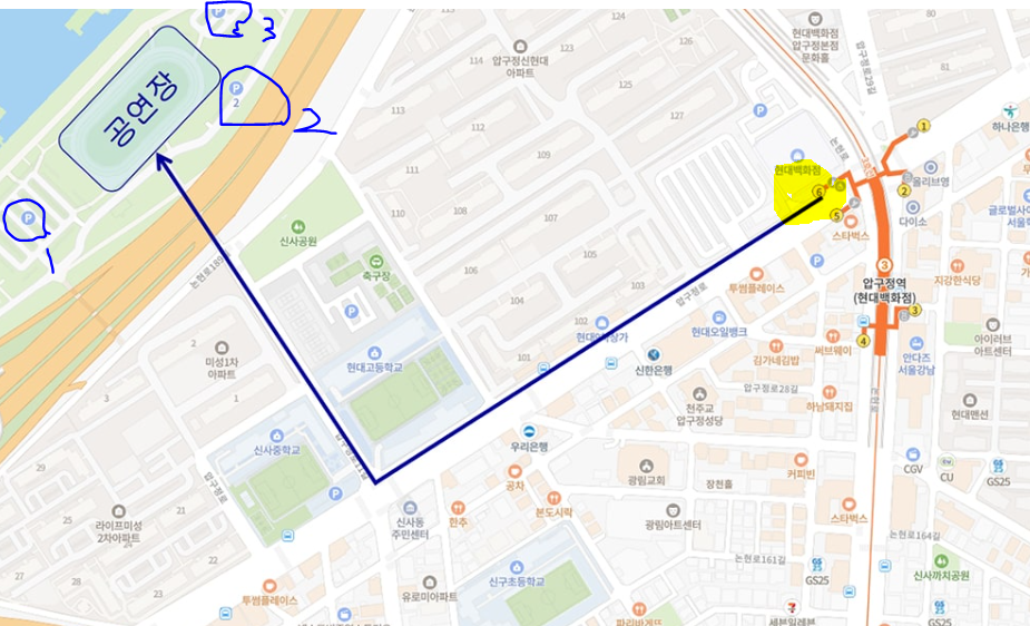 - 압구정역 6번 출구 직진 후(550m) 현대고등학교에서 우회전, 한강공원 신사나들목까지 직진