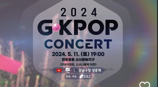 강남에서 5월 가정의 달을 맞이하여 서울 비전 2030 "매력 넘치는 한강" 프로젝트와 연계하여, 전 세대가 함께할 수 있는 K-POP 공연을 개최한다고 합니다. 시원한 한강뷰를 배경으로, 한강공원 신사잠원지구 럭비장에서 펼쳐지는 공연은 4,000여 석의 규모로 지정 좌석, 스탠딩석, 피크닉 존 등 무료로 누구나 5월 한강 콘서트를 즐기실 수 있습니다. 콘서트 일정 및 라인업 확인하시고 즐거운 무료 K POP 콘서트를 즐기시길 바랍니다.