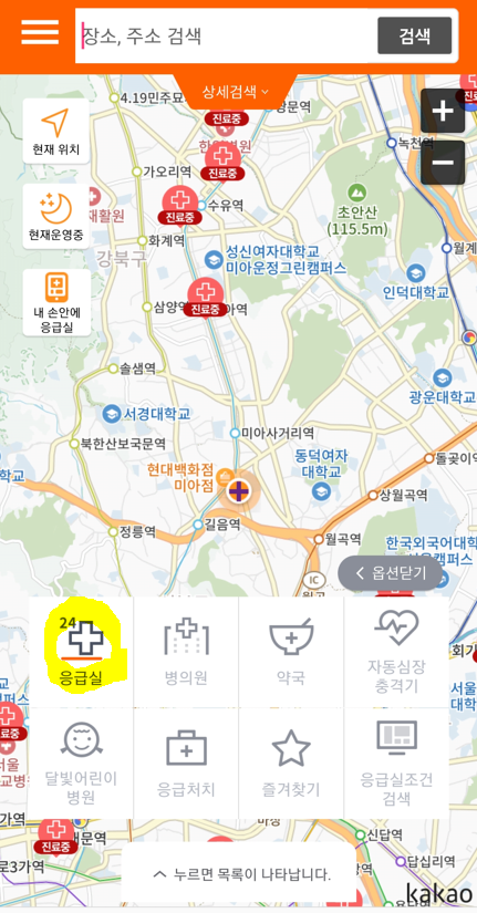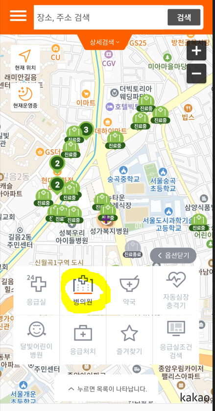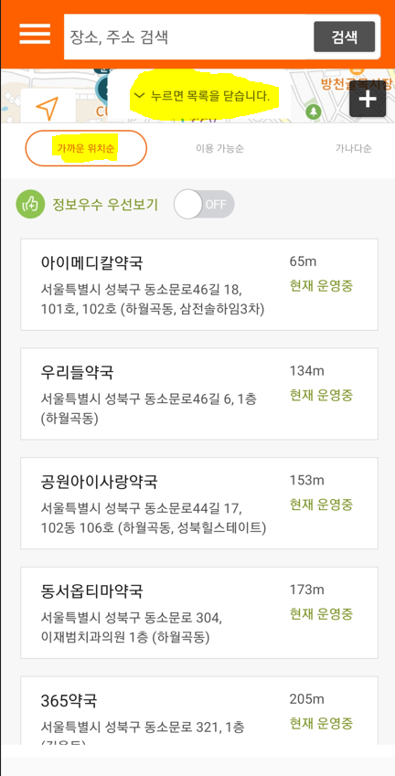 찾으시는 의료정보 선택 후 앱 하단 중앙의 "누르면 목록이 나타납니다" 버튼을 누르면, 해당 의료기관의 자세한 상호명, 주소, 전화번호, 영업현황 등을 한눈에 확인할 수 있습니다.