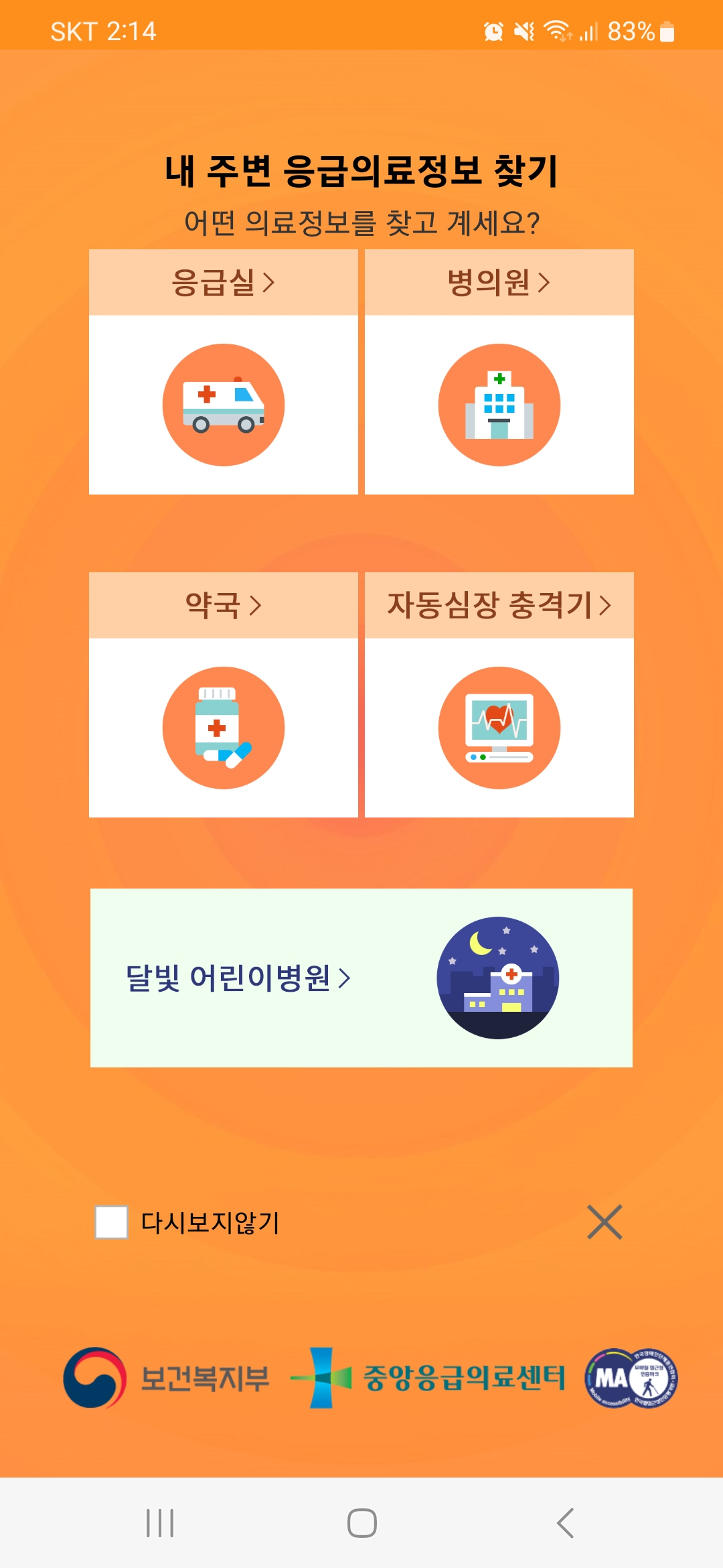 보건복지부에서 제공하는 응급의료정보제공 앱 E-Gen(이젠)은 사용자 위치 기반으로 주변에 문 여는 병·의원과 약국을 지도로 보여주고 진료시간과 진료과목 조회도 가능합니다. 또한 야간진료기관 정보, 자동심장충격기(AED) 위치 정보, 응급처치 요령 등 응급상황에 유용한 내용들도 담겨 있어 필요시 참고 지침이 됩니다.