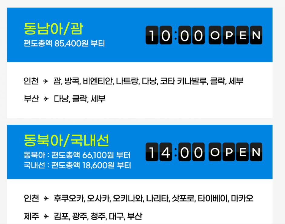 3)노선별 특가운임 : 동남아/괌 편도 85,400원 부터(괌, 방콕, 비엔티안, 나트랑, 다낭, 코타 키나발루, 클락, 세부)
