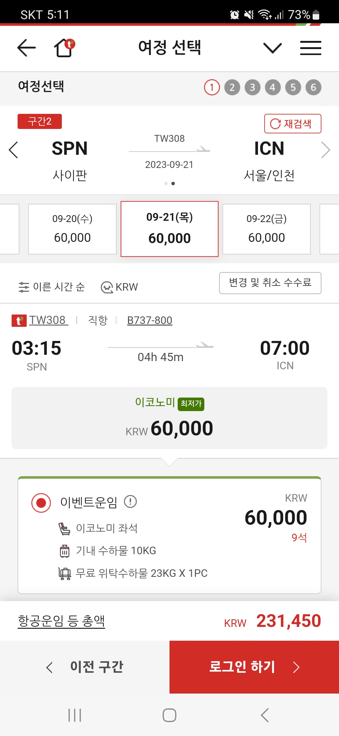 7월 17일 오후 5시 넘은 시간 티웨이 항공 특가를 검색해보았습니다. 지난 5월 괌의 태풍 피해로 인해 사이판으로 여행객이 몰리면서, 사이판 항공료가 상승 했었습니다. 길어지는 장마와 최근 집중호우로 인한 피해 등의 사회적 이슈등을 고려해 9월에 중순 늦은 휴가로 사이판을 설정하여 항공료 검색을 해보았습니다.