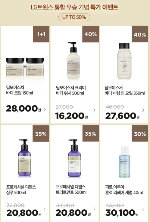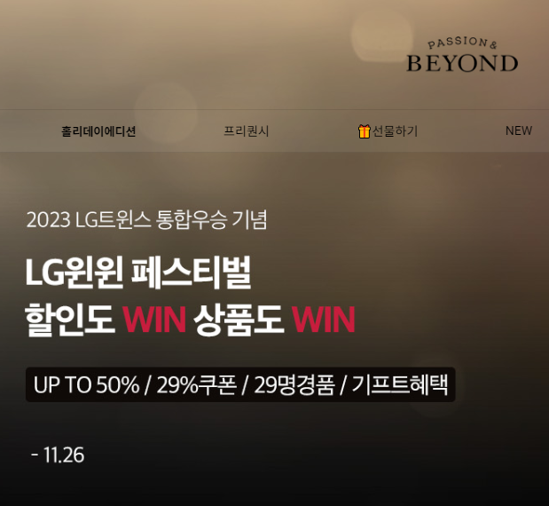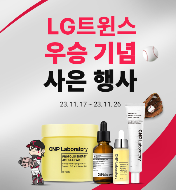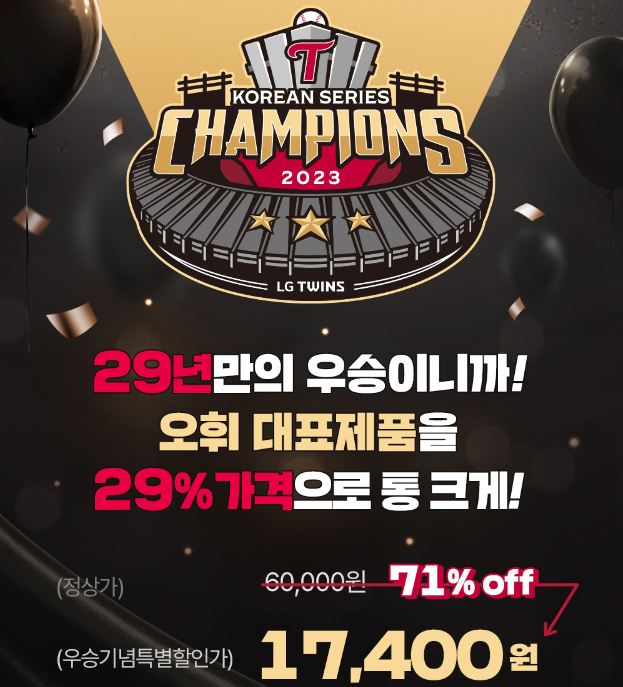 29년 만에 프로야구 한국시리즈 우승의 한을 푼 LG가 'LG윈윈 페스티벌'이라는 이름의 우승 턱으로 가전 29% 세일과 더불어, 화장품과 생활용품 업체인 LG생활건강도 29년 만의 야구 우승을 기념해 17일부터 재고 소진 때까지 ‘오휘’ ‘CNP’ 같은 자사 대표 브랜드 제품을 71% 할인한 ‘29%’ 가격과 기본29%할인에 반값할인까지 대박행사를 온라인 직영몰에서 진행하고 있습니다. 이번 행사를 통해 저렴하게 구매할 수 있는 기회이니, 재고 소진 전 빠르게 득템 하시기 바랍니다.