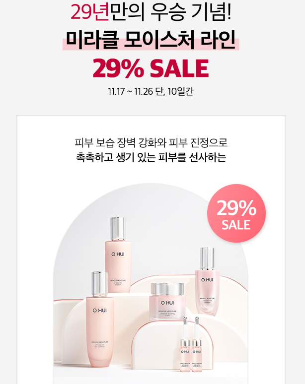 29년 만에 프로야구 한국시리즈 우승의 한을 푼 LG가 'LG윈윈 페스티벌'이라는 이름의 우승 턱으로 가전 29% 세일과 더불어, 화장품과 생활용품 업체인 LG생활건강도 29년 만의 야구 우승을 기념해 17일부터 재고 소진 때까지 ‘오휘’ ‘CNP’ 같은 자사 대표 브랜드 제품을 71% 할인한 ‘29%’ 가격과 기본29%할인에 반값할인까지 대박행사를 온라인 직영몰에서 진행하고 있습니다. 이번 행사를 통해 저렴하게 구매할 수 있는 기회이니, 재고 소진 전 빠르게 득템 하시기 바랍니다.