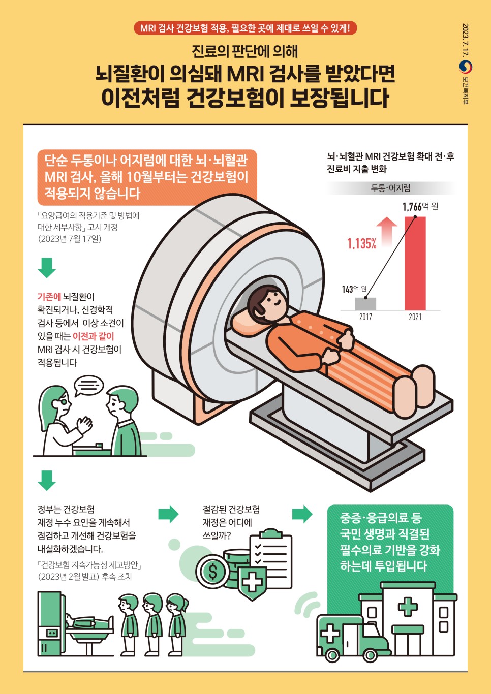 보건복지부는 2023년 7월 17일 ‘뇌 뇌혈관 MRI 검사, 뇌질환 의심 등 꼭 필요한 경우에만 건강보험이 보장되도록 고시를 개정한다’고 밝혔습니다.오는 10월 1일부터 뇌질환과 무관한 단순 두통이나 어지럼으로 찍은 뇌·뇌혈관 자기공명영상(MRI)에는 건강보험이 적용되지 않습니다.