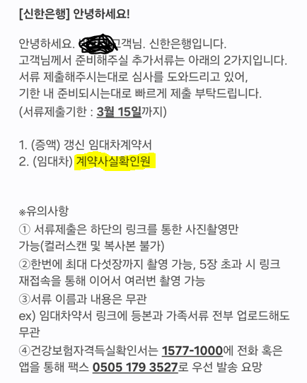 신한은행 계약사실확인원 서류 요청문자