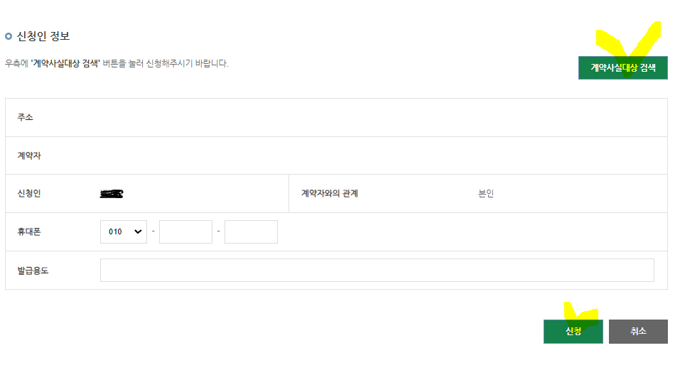• 다음 화면에서 계약 사실 대상 검색을 합니다.