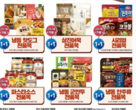 - 냉동 핫도그, 만두, 어묵, 시리얼 전품목, 잼류 1+1 판매예정